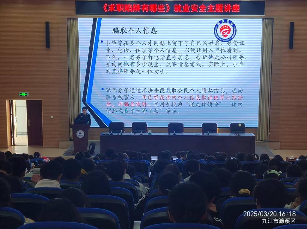 本次讲座是学校就业安全教育活动之一,旨在增强大学生风险防范意识和信息安全意识,为即将走出校门、进入社会的毕业生精准避开各种求职陷阱、顺利开启职业生涯保驾护航。