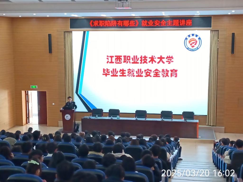 3月20日下午,我校在濂溪校区办公楼一楼报告厅开展“求职陷阱有哪些”就业安全主题讲座。本次讲座由招就处、保卫处联合举办,校大学生就业协会承办,特邀九江市公安局濂溪区分局十里派出所二级警长马维作为主讲人。招就处、保卫处相关负责人,各二级学院就业老师、在校生代表300余人到场聆听。