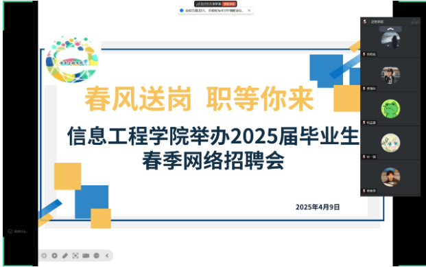 “春风送岗 职等你来” ——信息工程学院举办2025届毕业生春季网络招聘会 本网讯(信息工程学院)4月9日至11日,信息工程学院举办2025届毕业生春季网络招聘会。该院400余名毕业生线上参与,截至4月17日,共投递电子简历150余份,初步达成就业意向30余人。