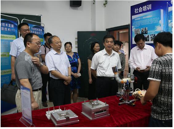 周金堂一行首先实地参观了我校科技周主题展厅,听取了科技创新成果介绍。在参观过程中,周金堂不时询问科技成果转化等情况,对我校师生的创新创意表示赞赏。随后,周金堂一行深入我校工业工程中心,参观考察了现代制造中心、逆向工程实训室、电子产品制作中心、航海驾驶训练中心、现代检测技术中心、数控高精加工实训基地等实践教学场所,对我校的实验实训条件、教育教学成果给予了高度评价。