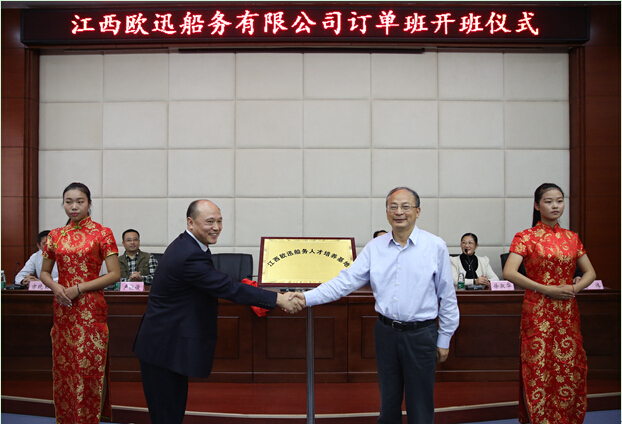 刘南平副校长在仪式上讲话,他首先对江西欧迅船务有限公司表示热烈欢迎和感谢,对加入订单班的学生表示祝贺。他说,实施订单培养、协同育人、推进现代学徒制是人才培养模式改革的主基调,近些年学校在创新人才培养方面作了大量工作,取得了可喜的成绩,我们与江西欧迅船务有限公司的合作就是一个成功的范例。讲话中,刘副校长对订单班提出三点希望:一是希望订单班的同学们珍惜机会,履行“江西欧迅船舶有限公司准员工”和“九江职院学生”的双重职责,严格要求自己,不断融入企业文化,积极参加企业实践,自觉遵守企业和学校的各项规章制度,不断提高自己的技能水平和职业素养,为将来的发展奠定基础;二是希望合作专业的老师们把握机遇,积极参与互动交流,利用“江西欧迅船务人才培养基地”这个平台进行工程实践,了解并尽快掌握与船舶行业发展相关的新技术、新工艺,并结合实际运用到学生日常的技能训练之中,培养出更多更优秀的、符合船舶行业发展需要的技术技能人才;三是希望校企合作双方以此为起点,不断拓宽合作领域,加大合作力度,加强人员交流,探索有效机制,共同为合作专业的建设与改革,为江西欧迅船务有限公司和学校的建设发展做出贡献。