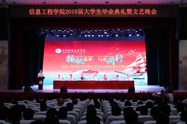 九江职院新闻网讯(信息工程学院)6月12日19时,信息工程学院“扬帆逐梦•与爱同行”2019届大学生毕业典礼暨文艺晚会在十里校区大礼堂举行。学校党委书记魏寒柏博士出席并致辞,党委副书记刘南平出席,教务处、学工处、后勤管理处(后勤服务集团)、团委等部门负责人,信息工程学院班子成员和近1000名师生代表参加。毕业典礼由该院党总支书记汤新祥主持。