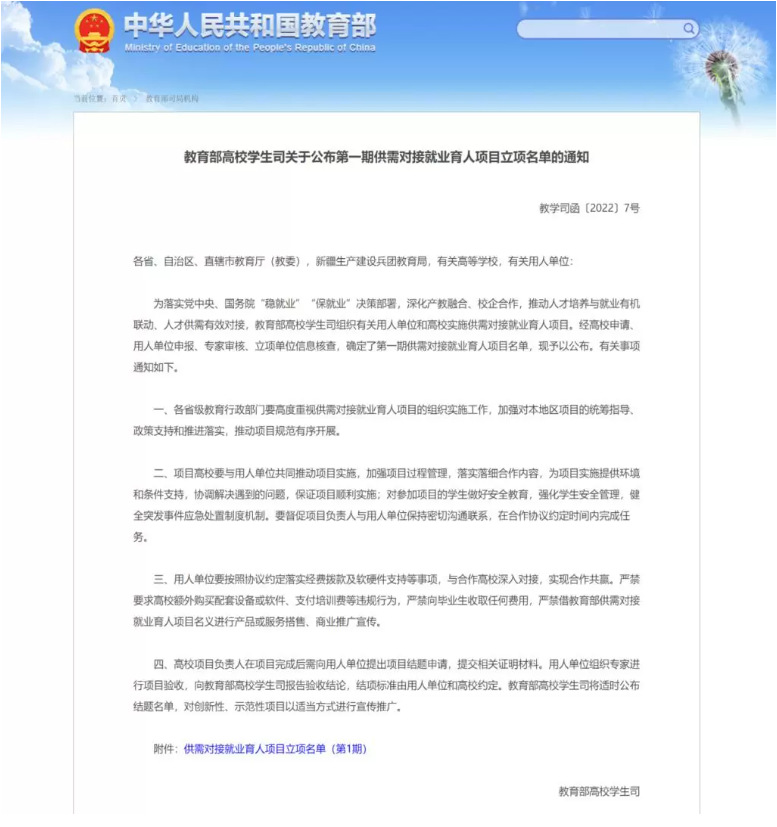据悉,供需对接就业育人项目是教育部高校学生司为落实党中央、国务院“稳就业”“保就业”决策部署,推动人才培养与就业有机联动、人才供需有效对接、毕业生高质量就业而设置,旨在进一步深化产教融合、校企合作,更好地汇聚企业资源,创新供需对接就业育人机制,实现校企双赢工作格局。