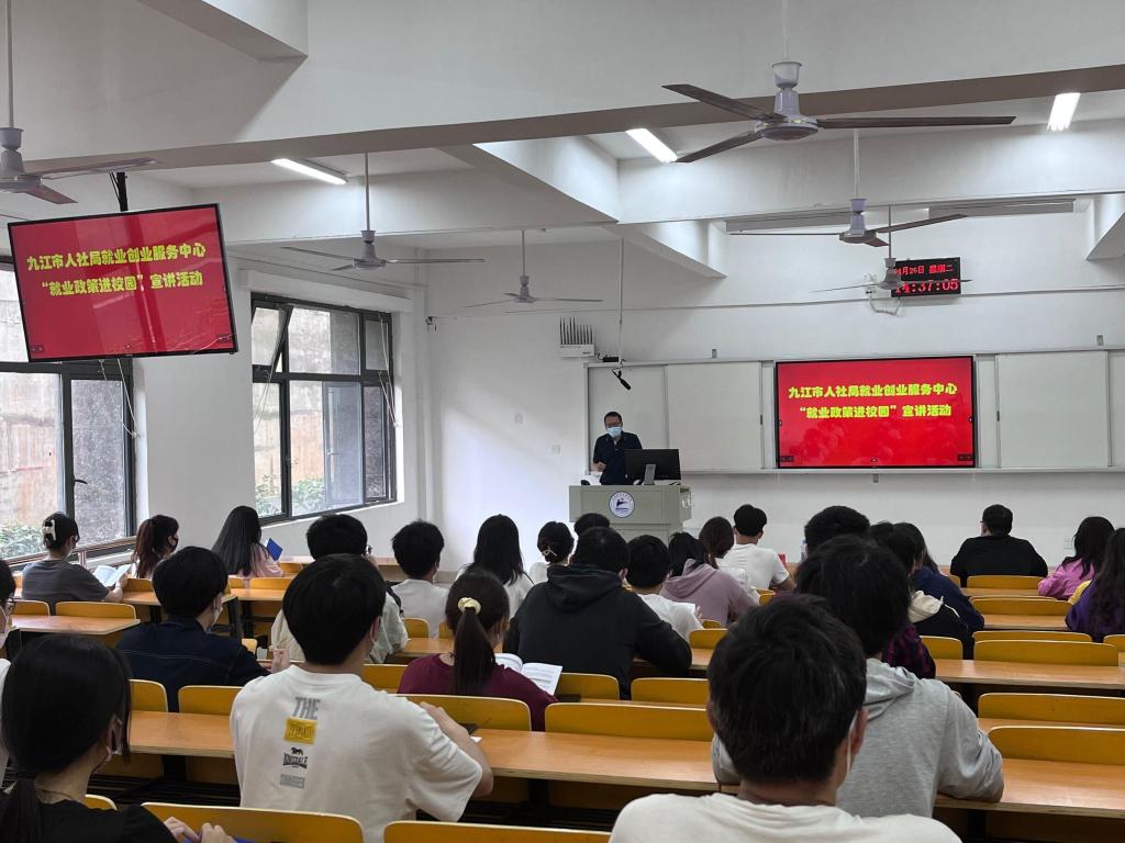 九江职院新闻网讯(招生就业处)4月26日下午,我校在濂溪区科创楼103成功举办九江市人社局就业创业服务中心“就业政策进校园”宣讲活动,九江市人社局就创中心副主任陈瑞生担任主讲,市人社局就创中心副主任余萍、刘丹及九江百城网总经理姚鹏陪同参加,来自各二级学院师生代表到场聆听。