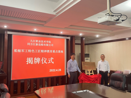 同时,举行了“九江职业技术学院船舶军工特色工匠精神教育重点基地”揭牌仪式。总经理助理孙文革表示企业将全力支持学校的素质拓展工作,切实发挥船舶军工特色工匠精神教育重点基地的作用,把兴船报国、作风优良、甘于奉献、勇攀高峰的军工精神传承给学生。