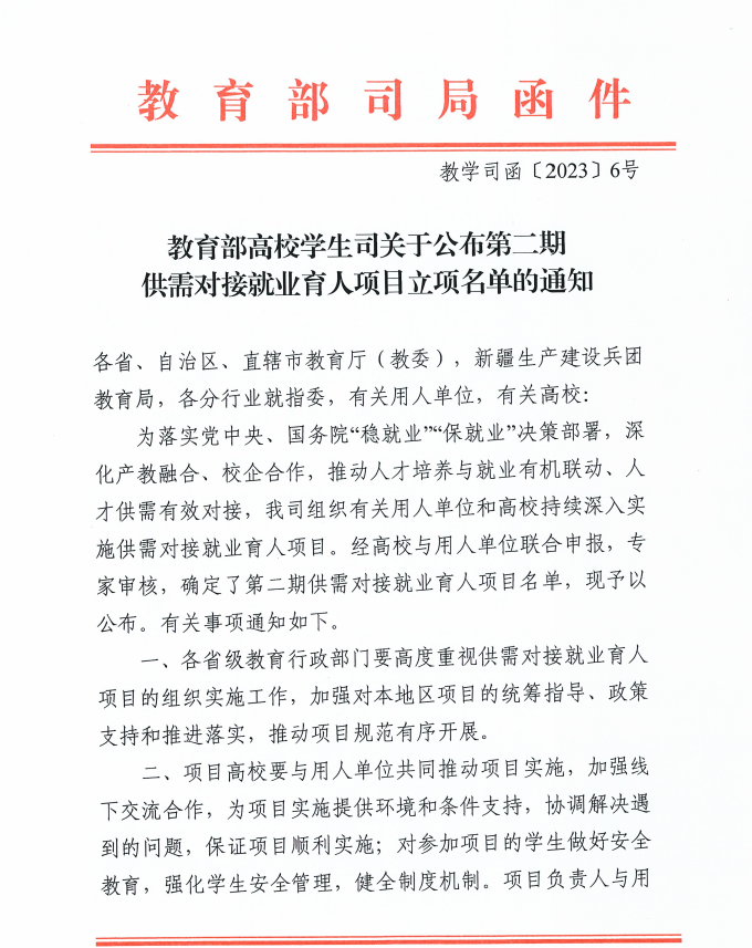 教育部供需对接就业育人项目是贯彻落实党中央、国务院“稳就业”“保就业”决策部署,深化产教融合、校企合作,推动人才培养与就业有机联动、人才供需有效对接的重要举措。自2022年10月申报工作启动以来,我校积极组织各职能部门、二级学院认真研究教育部申报工作指南,全面梳理学校工作情况,主动与用人单位对接,沟通、协调、磋商相关合作事宜,对照申报要求,精心组织项目申报。经专家评审、教育部审核等环节,最终获批立项20项。