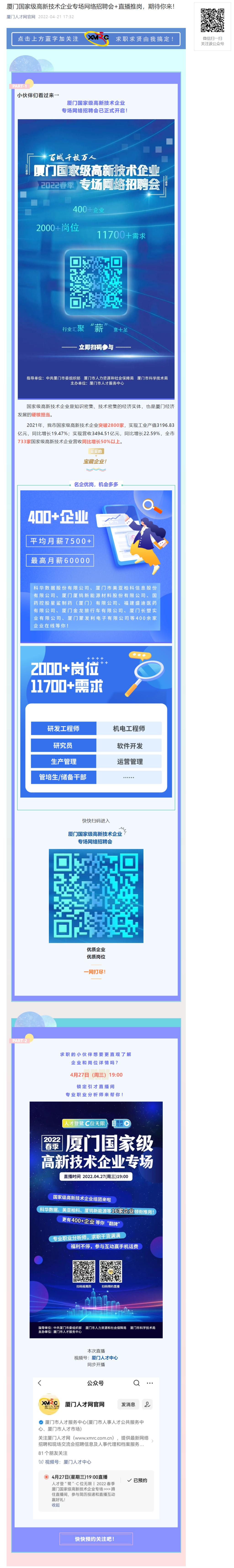 厦门国家级高新技术企业专场网络招聘会+直播推岗,期待你来!