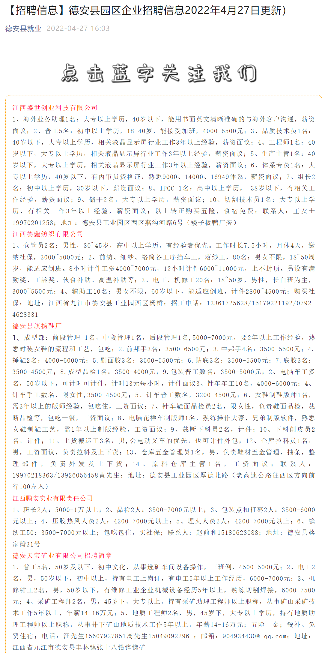 【招聘信息】德安县园区企业招聘信息2022年4月27日更新) (qq.com)