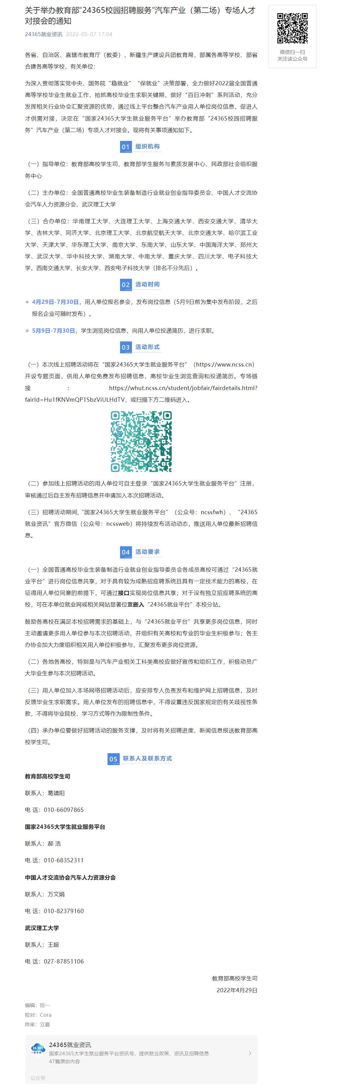 关于举办教育部“24365校园招聘服务”汽车产业(第二场)专场人才对接会的通知