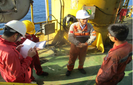 因表现出色,王师铎被公司提拔为维修组领班。要知道,钻井平台矗立在浩渺的大洋上,露出海面几十米以上。在平台上作业除了要面对恶劣海况和异常天气外,还要面临高空作业,石油、天然气泄露等危险。作为基层管理者和设备维修员,王师铎深刻认识到安全的重要性,不但自己要具备强烈的安全意识,还要加强对员工的安全培训。