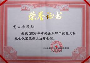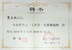 贾占杰2002年毕业于九江职业技术学院检测技术及应用专业,现为中国船舶重工集团公司第七一七所生产部光电装配高级技师。他是个非常帅气的满族小伙,在校读书时曾是学校的旗手。由于各类大赛成绩突出,技术超群,他先后获得了“全国青年岗位能手”和“全国技术能手”称号,入选“国防工业511高技能人才库”,并在2010年获聘七一七所首届“首席技师”。