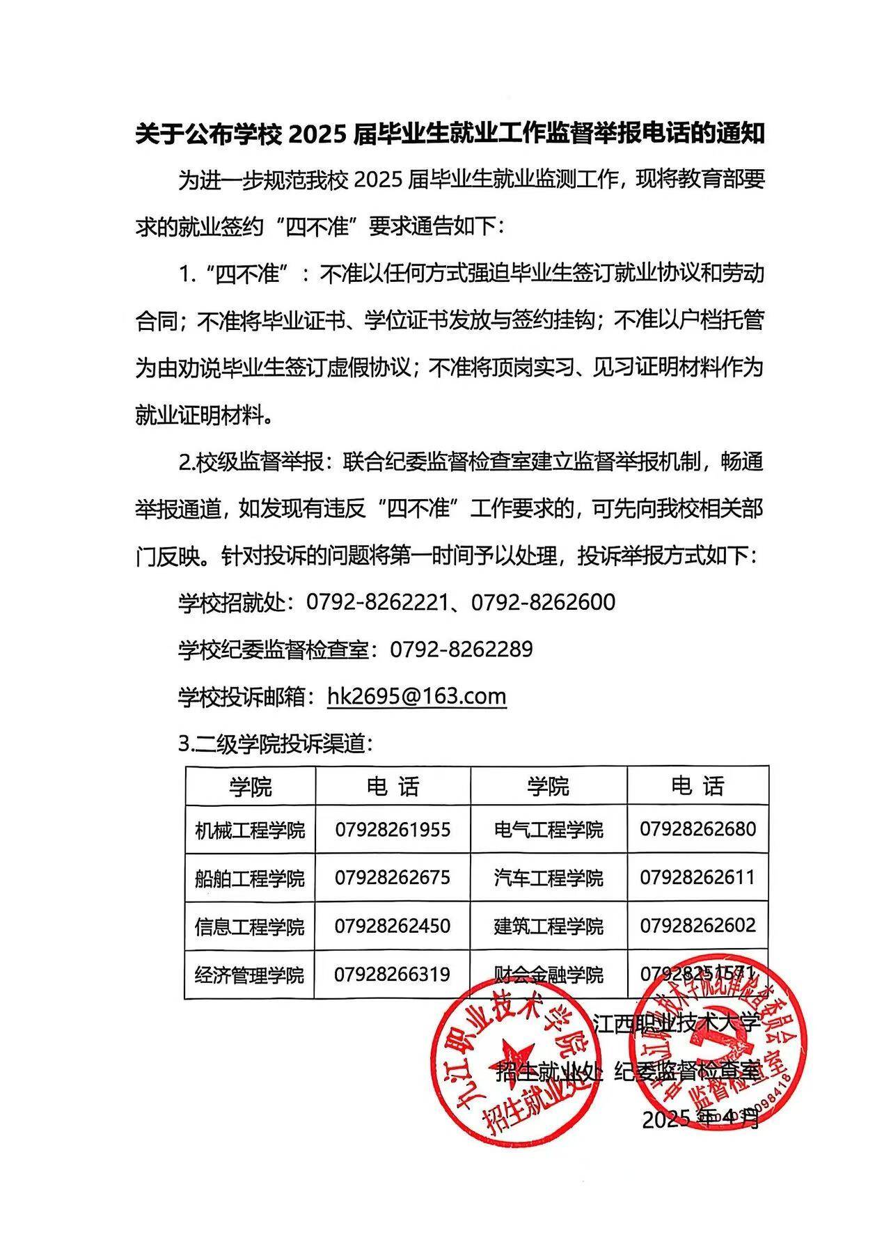 关于公布学校2025届毕业生就业工作监督举报电话的通知