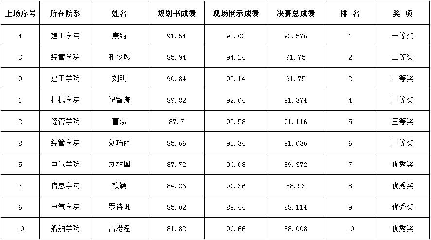 “规划未来,梦圆九职”大学生职业生涯规划大赛决赛已于昨晚(5.11)在四号学术厅圆满结束。经过评委盲审职业生涯规划书(30分,占30%)、选手现场自我展示及评委现场提问(70分,占70%),得出决赛总成绩及排名。现将各选手的总成绩、排名及奖项情况进行公示,请各负责老师、学生及时下载查看,并请于下周一(5.15)到招就处一楼领取荣誉证书。
