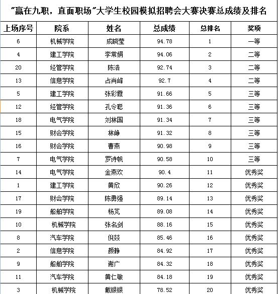 现将各选手的总成绩、排名及奖项情况进行公示,请各负责老师及时下载查看,并于下周一(11月13日)下午到招就处领取荣誉证书。