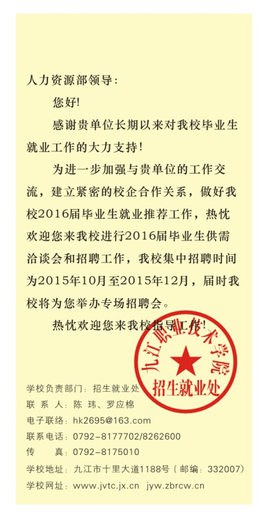 九江职院2016届毕业生就业邀请函
