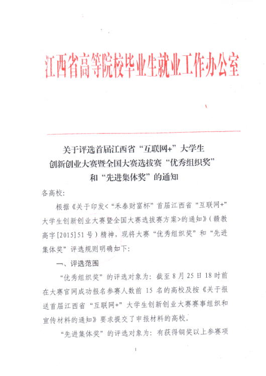 关于评选首届江西省“互联网+”大学生创新创业大赛暨全国大赛选拔赛“优秀组织奖”和“先进集体奖”的通知