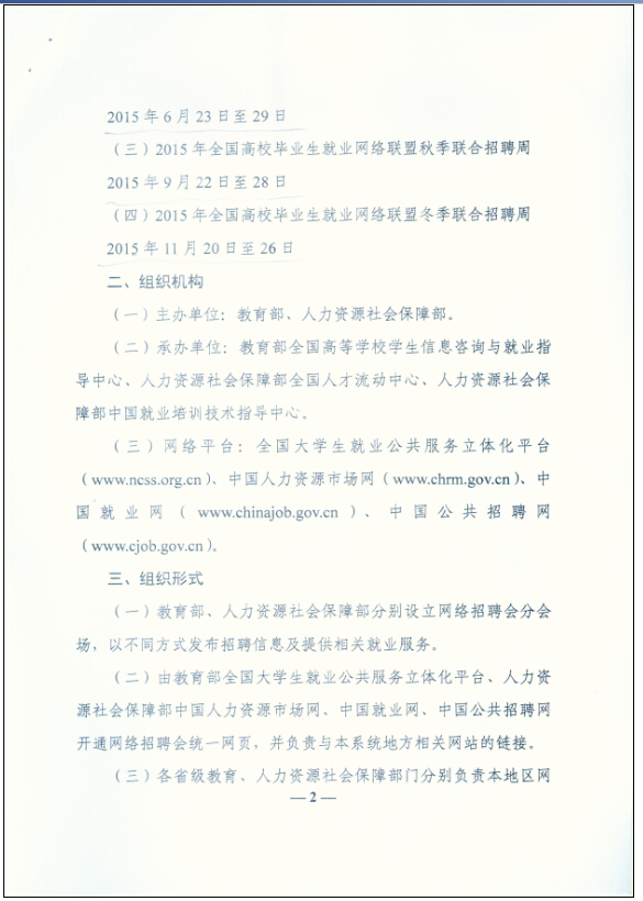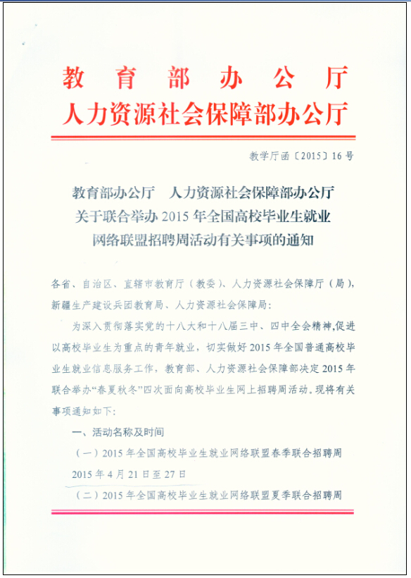 教育部办公厅 人力资源和社会保障部办公厅关于联合举办2015年全国高校毕业生就业网络联盟招聘周活动有关的事项的通知