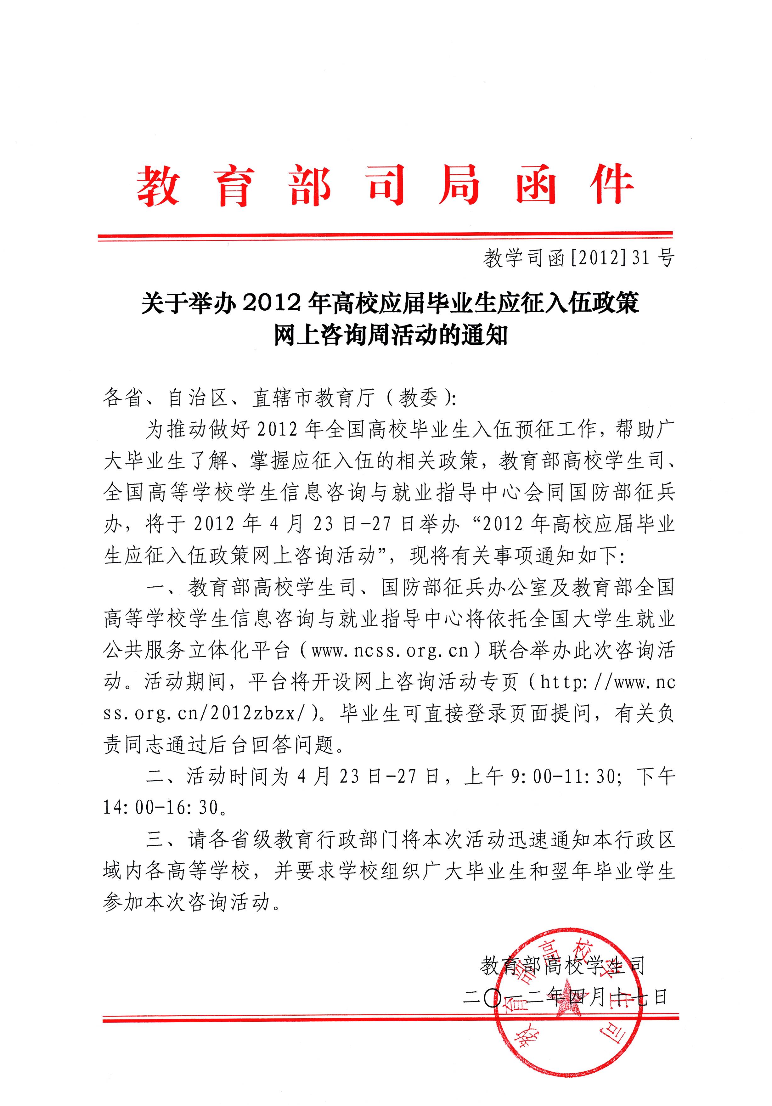 教育部关于举办2012年高校应届毕业生应征入伍政策网上咨询周活动的通知