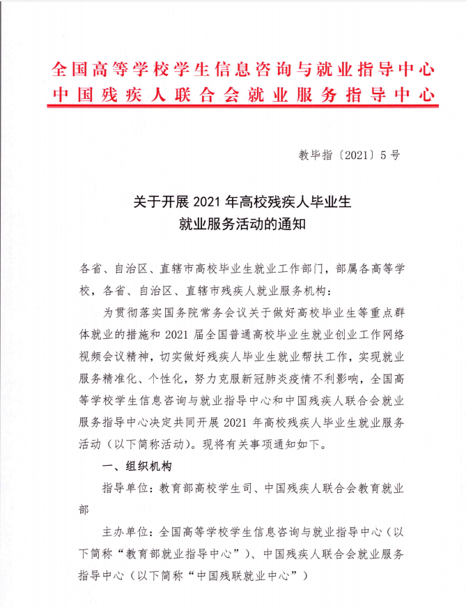 各二级学院:为切实做好残疾人毕业生就业帮扶工作,实现就业服务精准化、个性化,全国就业中心与残联就业中心共同开展2021年高校残疾人毕业生就业服务活动。请及时组织未就业毕业生参会!