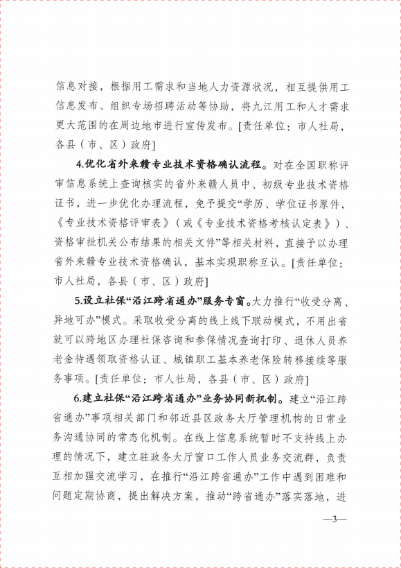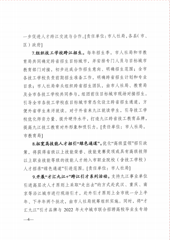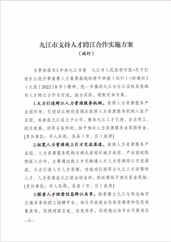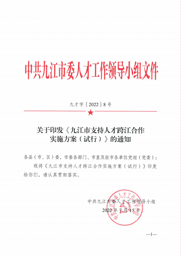 关于印发《九江市支持人才跨江合作实施方案(试行)》的通知