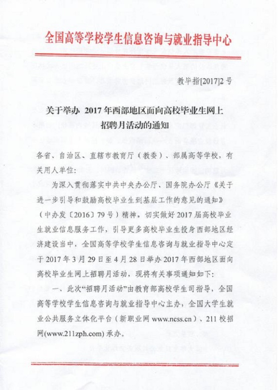 关于举办2017年西部地区面向高校毕业生网上招聘月活动的通知