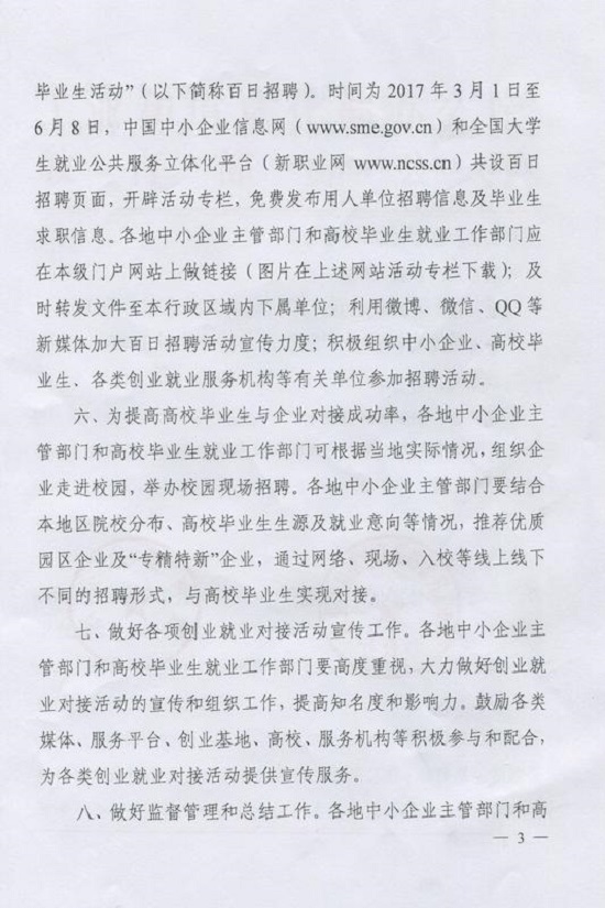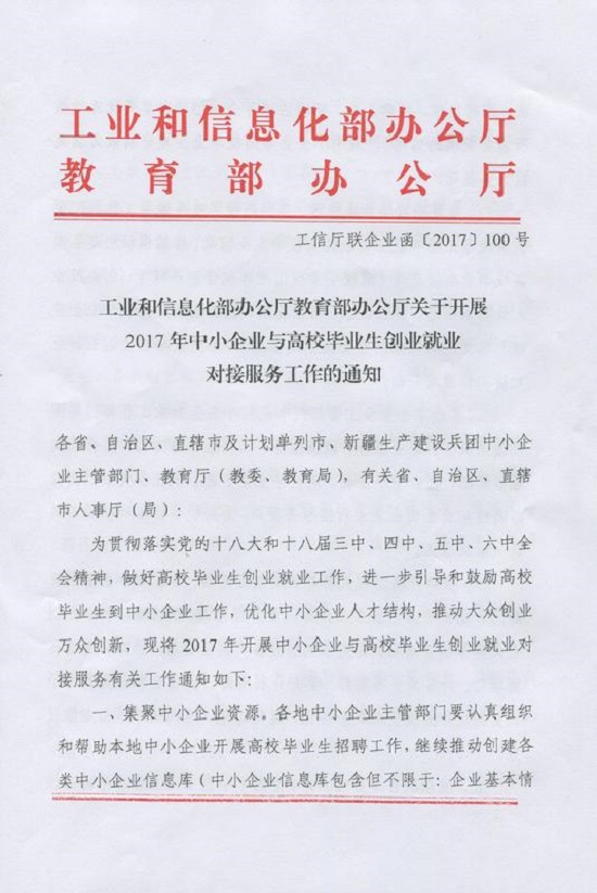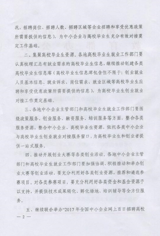 关于开展2017年中小企业与高校毕业生创业就业对接服务工作的通知