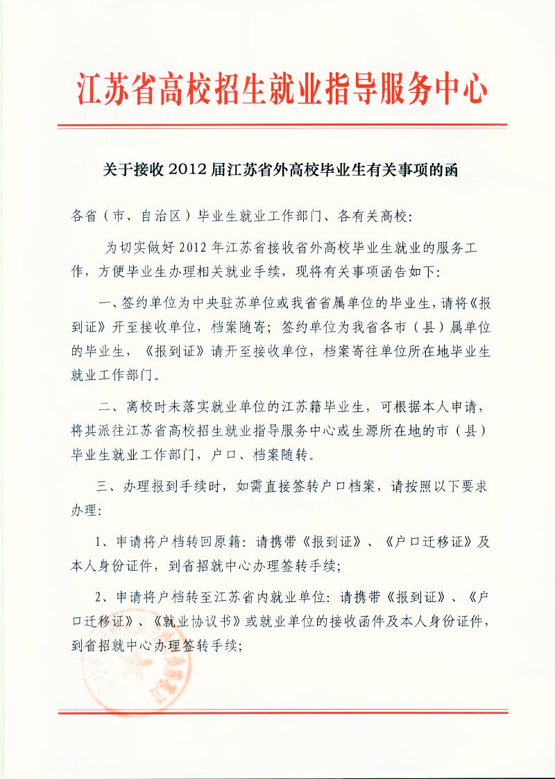 关于接收2012届江苏省外高校毕业生有关事项的函