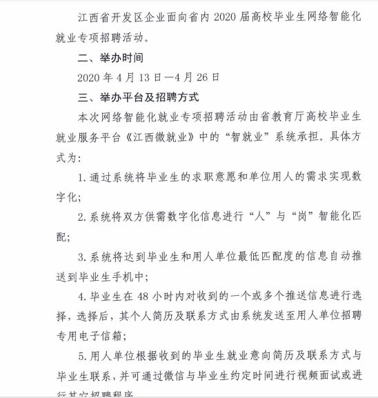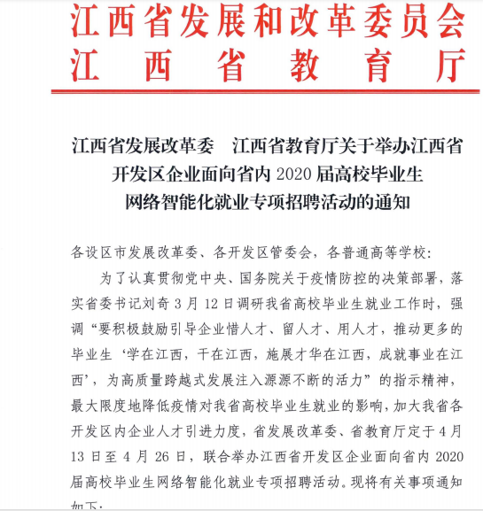 江西省发展和改革委员会 江西省教育厅关于举办江西省开发区企业面向省内2020届高校毕业生网络智能化