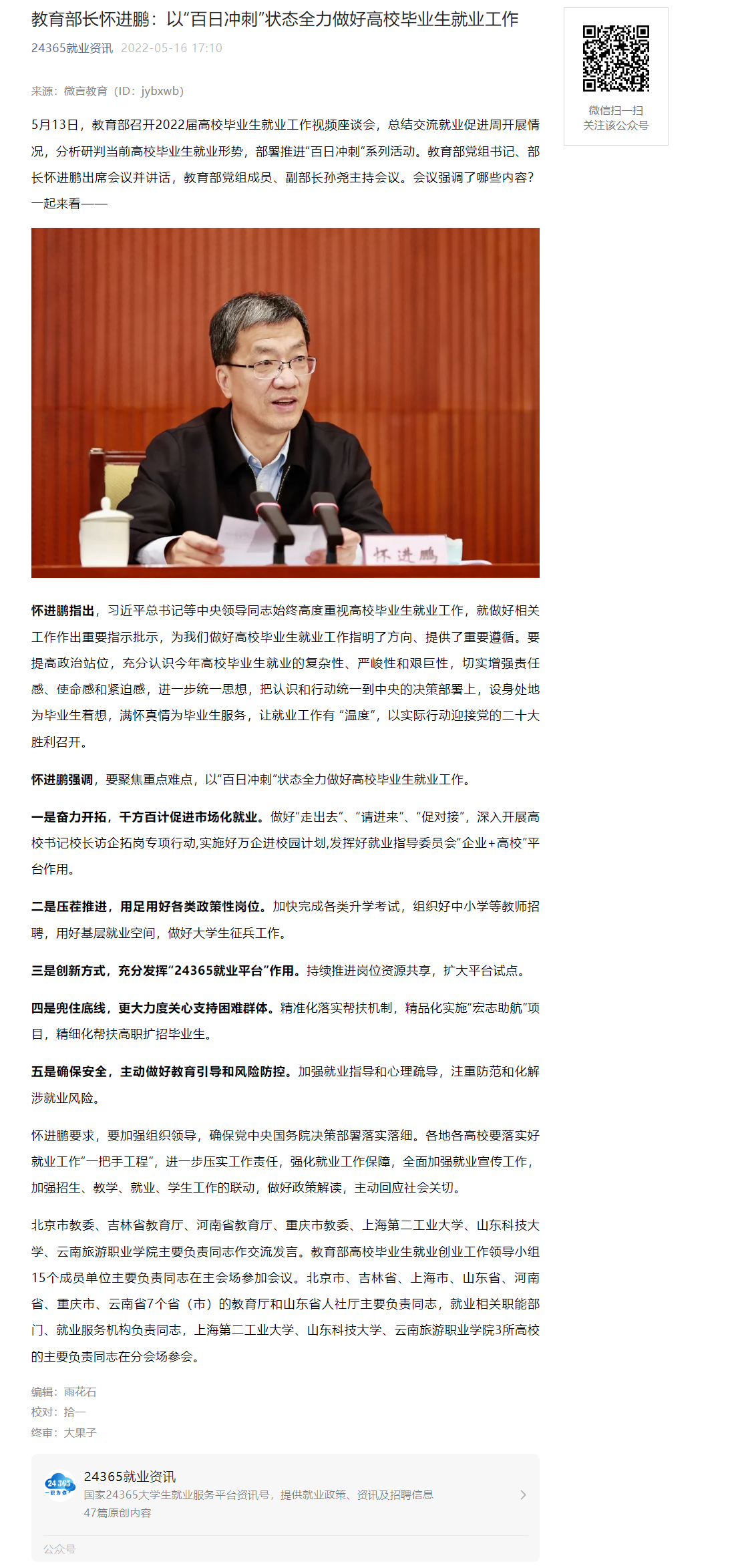 教育部长怀进鹏:以“百日冲刺”状态全力做好高校毕业生就业工作