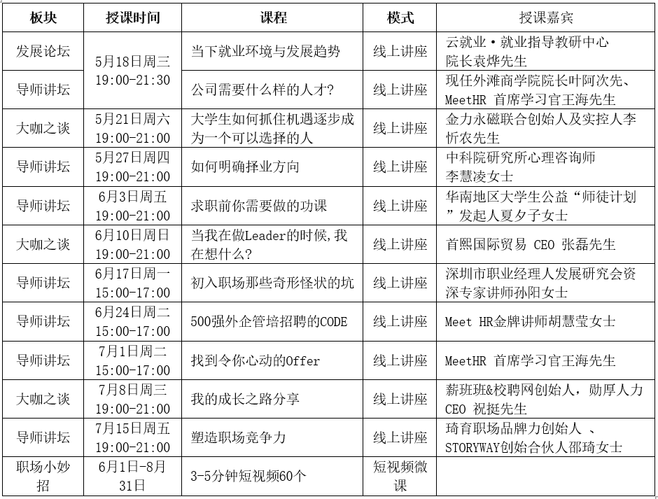根据《江西省人力资源和社会保障厅 江西教育厅关于开展“公共服务进校园”活动的通知》(人社厅函〔2022〕16号)要求,我们联合江西省人力资源协会组织了专业力量编制了《公共服务进校园之就业指导专题系列课程》在线课程。拟从5月18日起,面向全省高校2022届毕业生播放。请各高校就业部门根据本校毕业生特点,积极组织高校毕业生上线收听收看相关课程(课程安排如下)。
