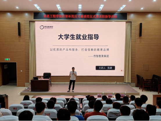讲座特邀传智教育集团——黑马程序员广州分公司就业部主管陈建担任主讲。陈建从当前就业形势出发,针对“如何制作一份完美的个人简历”“如何在面试环节脱颖而出”“如何展现自我优势”等方面为同学们讲述了一堂生动的就业指导课。