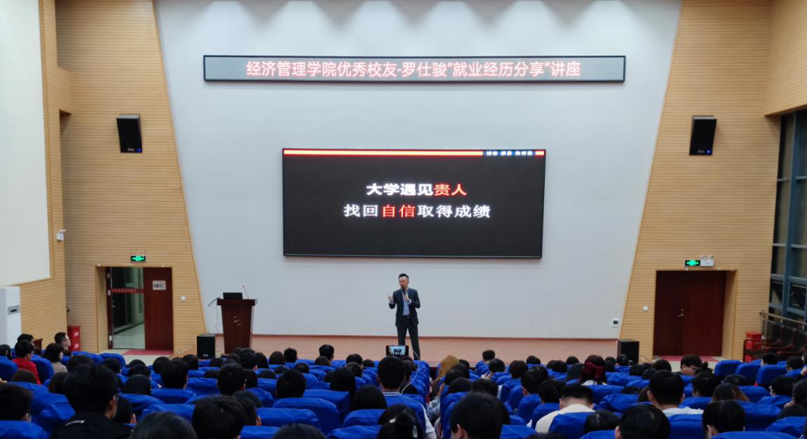 九江职院新闻网讯(经济管理学院 王浩力 丁瑛)9月23日19时30分,经济管理学院在濂溪校区图书馆报告厅举办“就业经历分享”专题讲座。赣州蓝梦管理有限公司董事长、该院07级管理专业毕业生罗仕骏担任主讲,毕业班学生代表300余人参加。