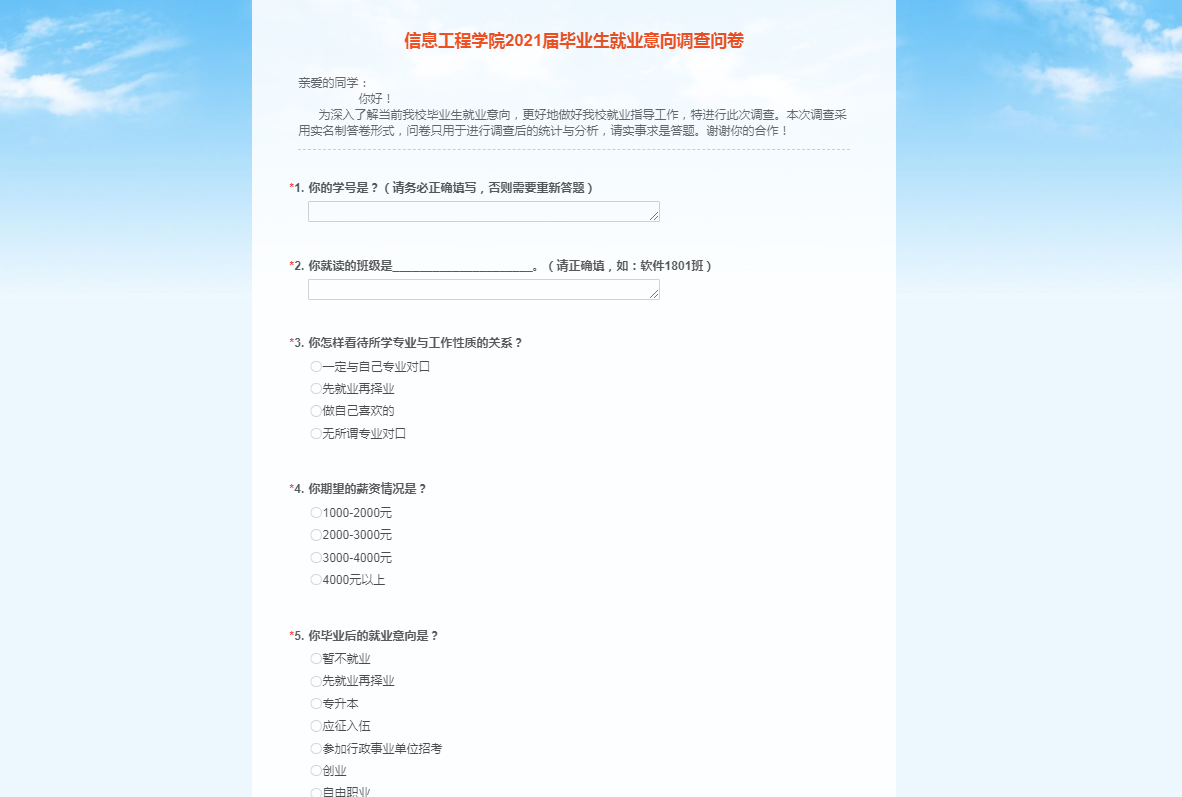 该院根据专业分类,从专业与工作性质、期望薪资、就业意向、就业单位性质、选择职业注重因素、就业单位条件、就业地域、基层就业等方面设置提问,精心设计了《信息工程学院2021届毕业生就业意向调查问卷》,并采用线上实名答卷的方式,收回有效答卷1800余份,真实传递了该院1800余名毕业生的求职意向、心理期望、职业定位等情况。